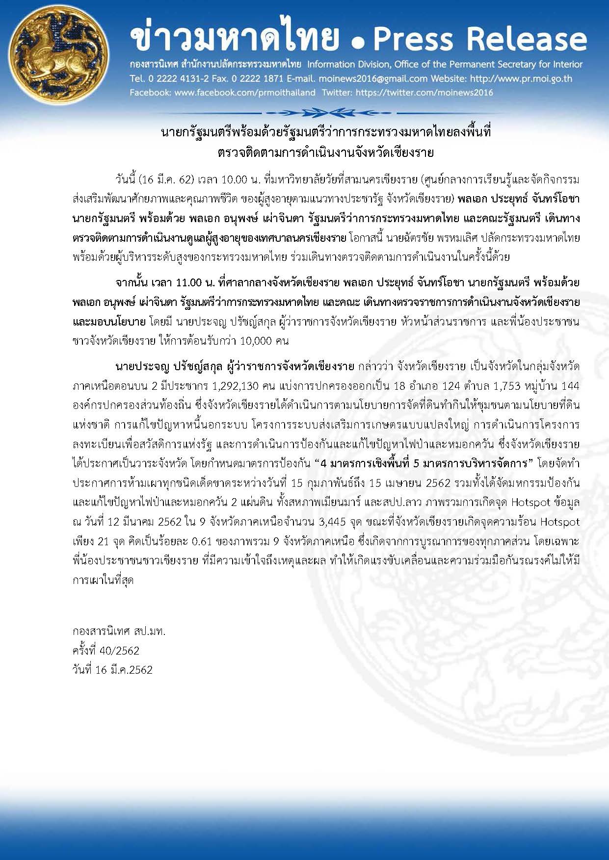 ข่าวมหาดไทย นายกรัฐมนตรีพร้อมด้วยรัฐมนตรีว่าการกระทรวงมหาดไทยลงพื้นที่ ตรวจติดตามการดำเนินงานจังหวัดเชียงราย โดย กองสารนิเทศ สำนักงานปลัดกระทรวงมหาดไทย 18 มีนาคม 2019 18 มีนาคม 2019 11 ยอดวิว ก่อนหน้า รัฐมนตรีว่าการกระทรวงมหาดไทย ลงพื้นที่ตรวจราชการและติดตามการเตรียมการจัดทำน้ำอภิเษก พร้อมมอบนโยบายการดำเนินงานของกระทรวงมหาดไทยให้แก่ผู้ว่าราชการจังหวัดภาคกลางและภาคตะวันออก ถัดไป กองบัญชาการป้องกันและบรรเทาสาธารณภัยแห่งชาติ ประชุมบูรณาการเตรียมการป้องกันและแก้ไขปัญหาภัยแล้ง ปี 2562 บทความที่เกี่ยวข้อง “มหาดไทย” ยกระดับเพิ่มประสิทธิภาพการตร... 15 ธันวาคม 2025 “รมช.มท.ก้อย-ศศิธร” แถลงข่าวมหกรรมของข... 15 ธันวาคม 2025 “อรรษิษฐ์ สัมพันธรัตน์” ปลัด มท. ประกา... 15 ธันวาคม 2025 สมเด็จพระกนิษฐาธิราชเจ้า กรมสมเด็จพระเทพรัตนราชสุด... 15 ธันวาคม 2025 มท.4 “ศศิธร” ลงพื้นที่ จ.เชียงใหม่ เปิ... 14 ธันวาคม 2025 “รมช.มท.ศักดิ์ดา” แถลง “ปิดกองบัญชาการ ปภ.ชาติ ส่ว... 14 ธันวาคม 2025 ผู้บัญชาการกองอาสารักษาดินแดน ขอบคุณและชื่นชมความเ... 13 ธันวาคม 2025 “รมช.มหาดไทย ศศิธร” เป็นประธานประชุมรัฐมนตรีอาเซีย... 13 ธันวาคม 2025 คกก.นโยบายลดอุบัติเหตุทางถนนแห่งชาติ เห็นชอบขับเคล... 12 ธันวาคม 2025