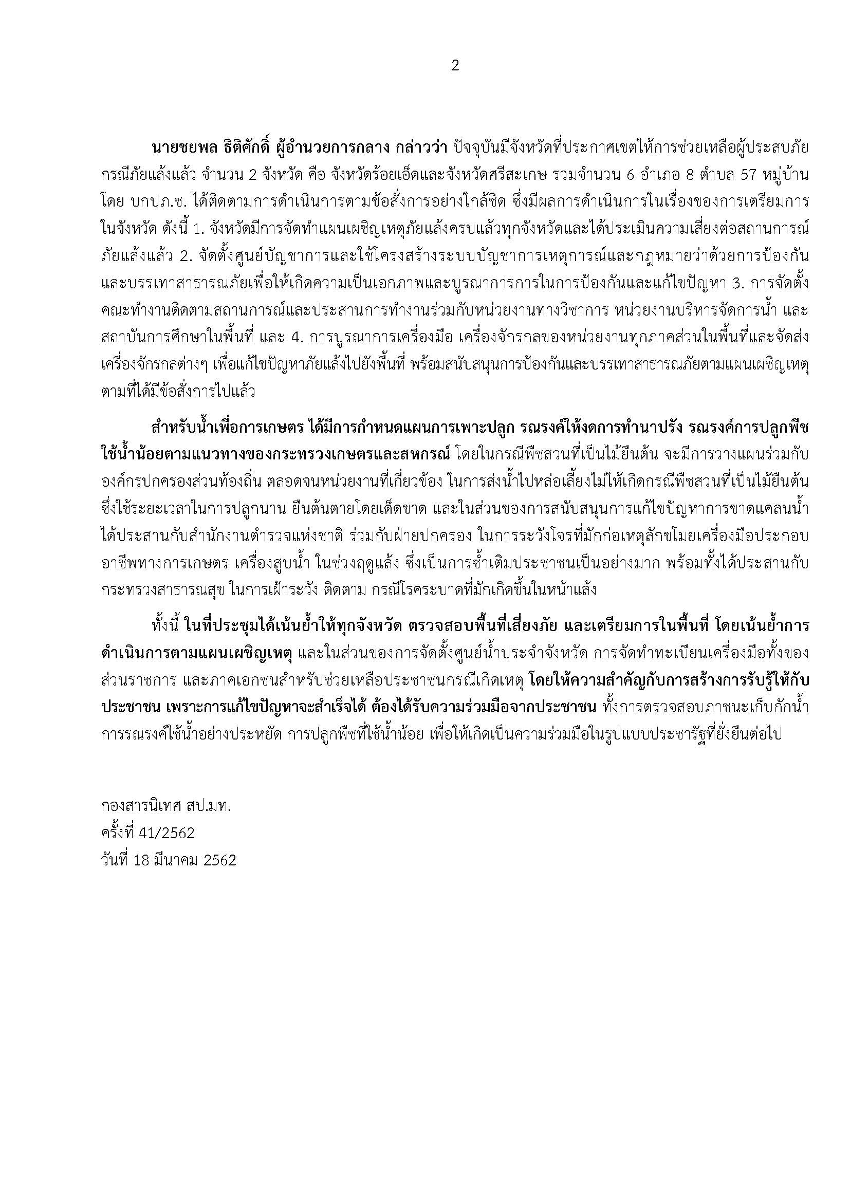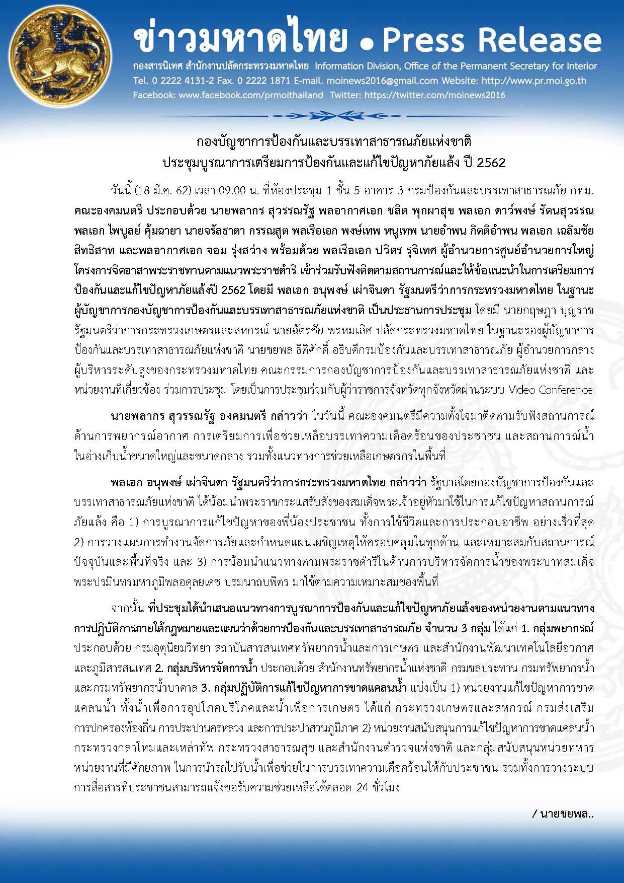 ข่าวมหาดไทย กองบัญชาการป้องกันและบรรเทาสาธารณภัยแห่งชาติ ประชุมบูรณาการเตรียมการป้องกันและแก้ไขปัญหาภัยแล้ง ปี 2562 โดย กองสารนิเทศ สำนักงานปลัดกระทรวงมหาดไทย 18 มีนาคม 2019 18 มีนาคม 2019 11 ยอดวิว ก่อนหน้า นายกรัฐมนตรีพร้อมด้วยรัฐมนตรีว่าการกระทรวงมหาดไทยลงพื้นที่ ตรวจติดตามการดำเนินงานจังหวัดเชียงราย ถัดไป รมช.มท. เป็นประธาน “งานวันท้องถิ่นไทย ประจำปี 2562” เพื่อน้อมรำลึกถึงพระมหากรุณาธิคุณของพระบาทสมเด็จพระจุลจอมเกล้าเจ้าอยู่หัว บทความที่เกี่ยวข้อง “มหาดไทย” ยกระดับเพิ่มประสิทธิภาพการตร... 15 ธันวาคม 2025 “รมช.มท.ก้อย-ศศิธร” แถลงข่าวมหกรรมของข... 15 ธันวาคม 2025 “อรรษิษฐ์ สัมพันธรัตน์” ปลัด มท. ประกา... 15 ธันวาคม 2025 สมเด็จพระกนิษฐาธิราชเจ้า กรมสมเด็จพระเทพรัตนราชสุด... 15 ธันวาคม 2025 มท.4 “ศศิธร” ลงพื้นที่ จ.เชียงใหม่ เปิ... 14 ธันวาคม 2025 “รมช.มท.ศักดิ์ดา” แถลง “ปิดกองบัญชาการ ปภ.ชาติ ส่ว... 14 ธันวาคม 2025 ผู้บัญชาการกองอาสารักษาดินแดน ขอบคุณและชื่นชมความเ... 13 ธันวาคม 2025 “รมช.มหาดไทย ศศิธร” เป็นประธานประชุมรัฐมนตรีอาเซีย... 13 ธันวาคม 2025 คกก.นโยบายลดอุบัติเหตุทางถนนแห่งชาติ เห็นชอบขับเคล... 12 ธันวาคม 2025